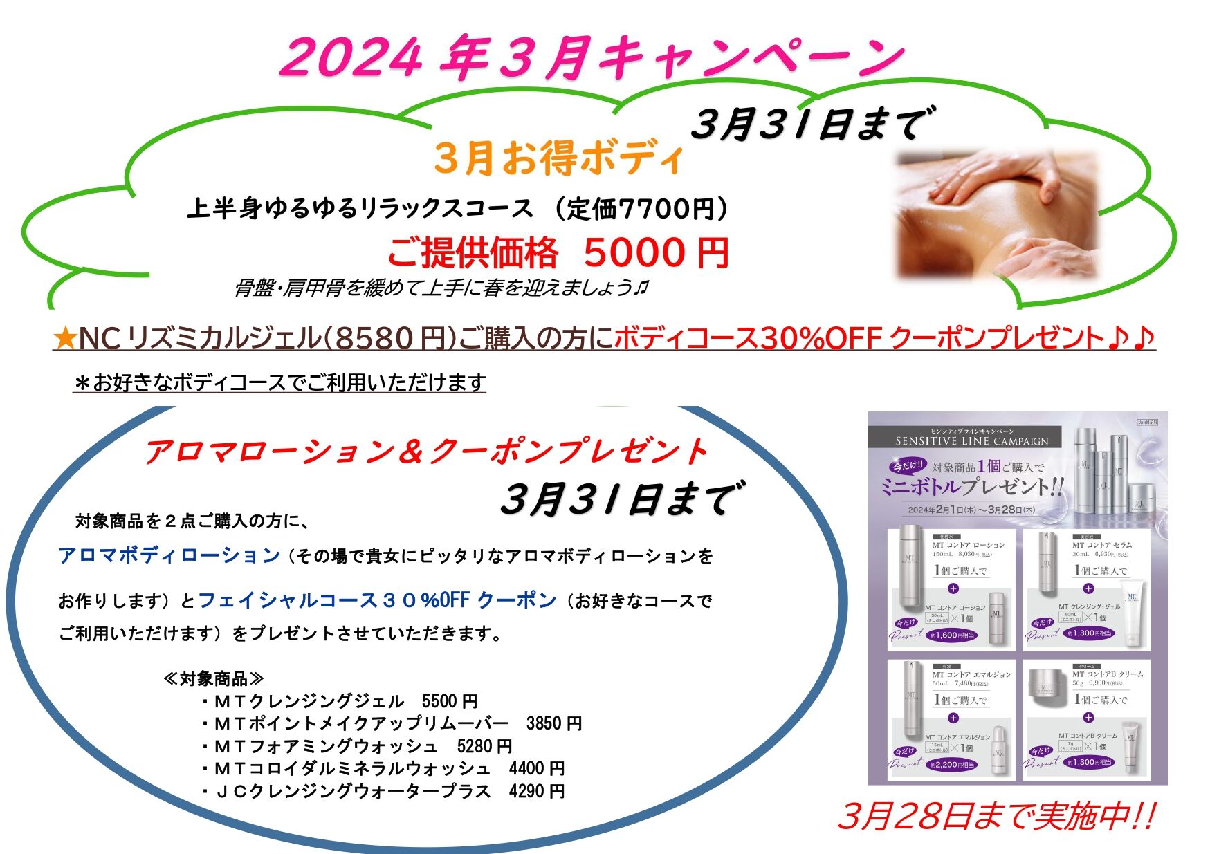 NCリズミカルジェル130g 8580円をご購入いただいた方にお好きなボディコースでご利用いただける30%OFFクーポンをプレゼントしています。